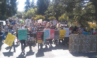 "Hopefully this group isn't representative of a new aggressive movement." Zach Friend, SCPD SpokesmanThe march was called only a few days before, billed on fliers as a march to picket banks and then to occupy a building (in some places it was a "foreclosed home", in other it was merely a "vacant property'). The day of the march, November 30th, people began gathering at 2pm near the Occupy Santa Cruz camp. By 2:45, when the march left, about 75 people had assembled. A mobile sound system arrived, playing among other things, a lot of Lady Gaga. The march left towards Chase bank on Water and Ocean for a brief picket and speeches. The picket felt a bit tense, with a strong sense of anticipation for the announced occupation.
