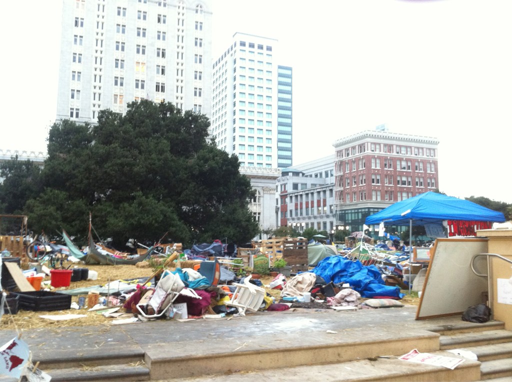 On the night of October 6th San Francisco Police attacked the Occupy SF encampment at the Federal Building on Market and Drum. After a day in which 800 people marched through downtown San Francisco in solidarity with the occupation of Wall Street in New York and elsewhere around the country, hundreds gathered at the site of the occupation. However by evening the police had administered an eviction notice to the occupiers claiming that the police would move in at midnight alongside the Department of Public Works to clear the plaza. Roughly around 10pm the police began to gather a block away from the occupation. Word circulated quickly and as both the occupiers and the police prepared roughly 150 people assembled at the occupation. After a few hours of waiting, debate, and nervous conversations within the occupation the police finally made their first move. Marching down the street, adorned with helmets and batons, the police escorted a line of Department of Public Works Vehicles. Standing between the occupiers and the living spaces that had been created since the occupations’ beginning, Department of Public Works workers were then forced to begin eradicating the space of any materials related to the occupation. The trucks were quickly filled with the same rapidity as the mood in the air began to intensify.